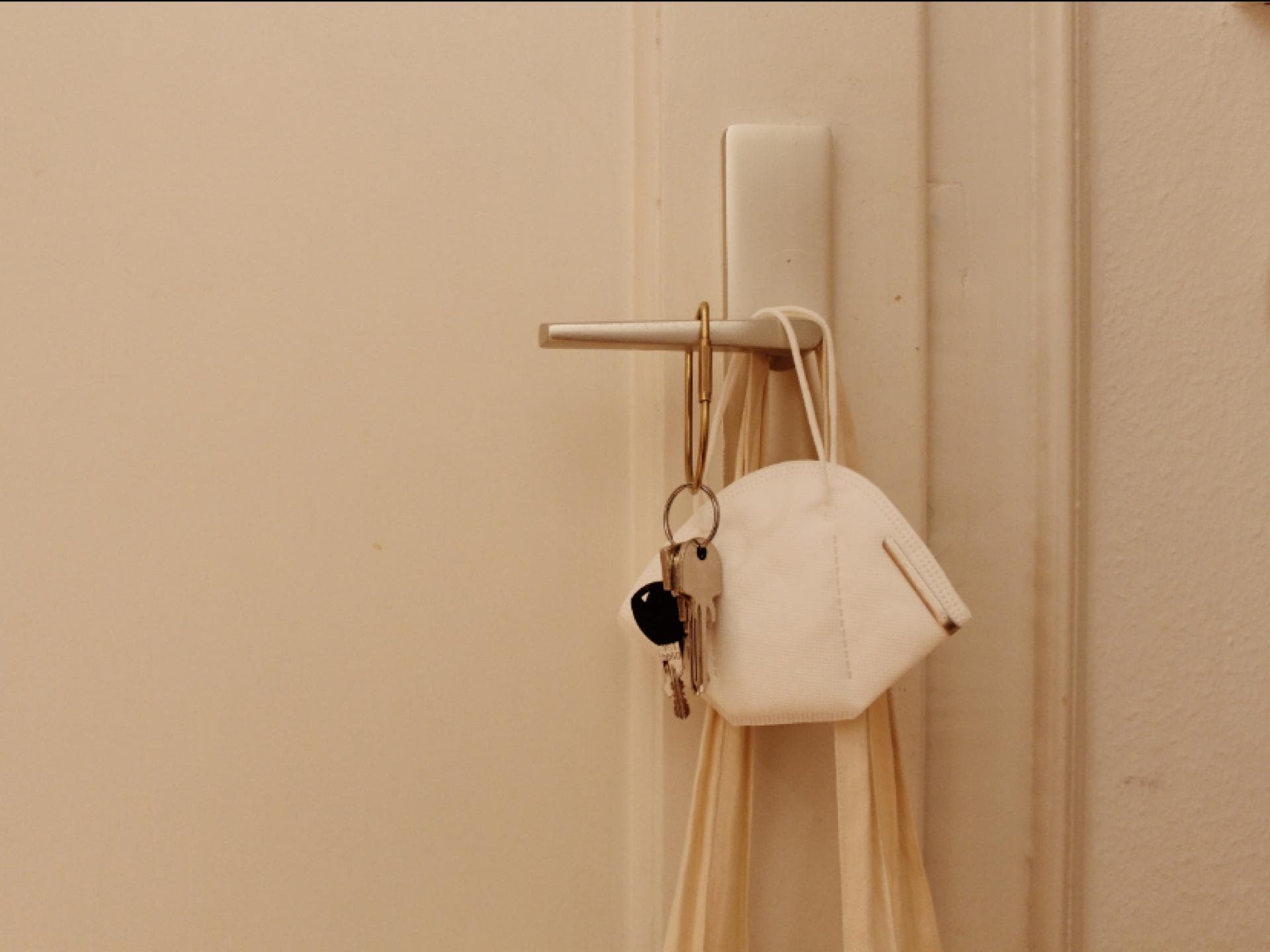 - Legen Sie die Maske nicht in eine verschließbare Box oder Tüte, sondern hängen Sie sie idealerweise an einem Haken oder auf einer Wäscheleine auf. Sie sollten genug Abstand zu anderen Gegenständen haben und nicht in Berührung mit Personen kommen.