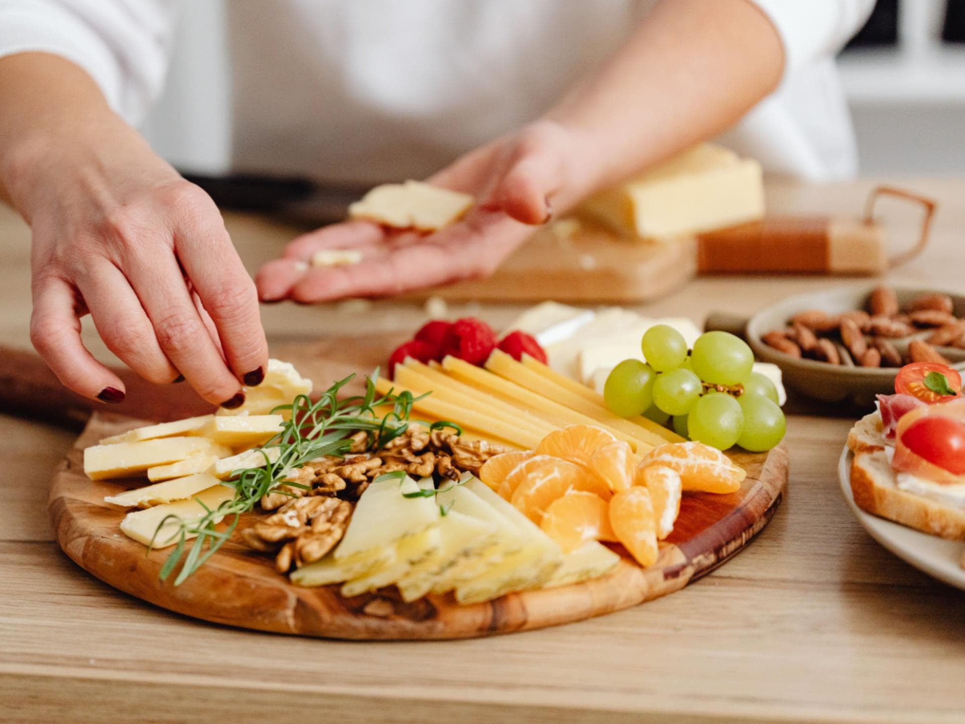 Weintrauben, Trockenfrüchte, Nüsse oder Beeren dürfen natürlich auch nicht fehlen. Streuen Sie die Zutaten überall dort hin, wo noch ein wenig Platz ist. Auch hier gilt: Lassen Sie sich von Ihrer Intuition leiten. Tipp: Auch Kräuter oder essbare Blüten verleihen der Käseplatte eine eindrucksvolle Optik.