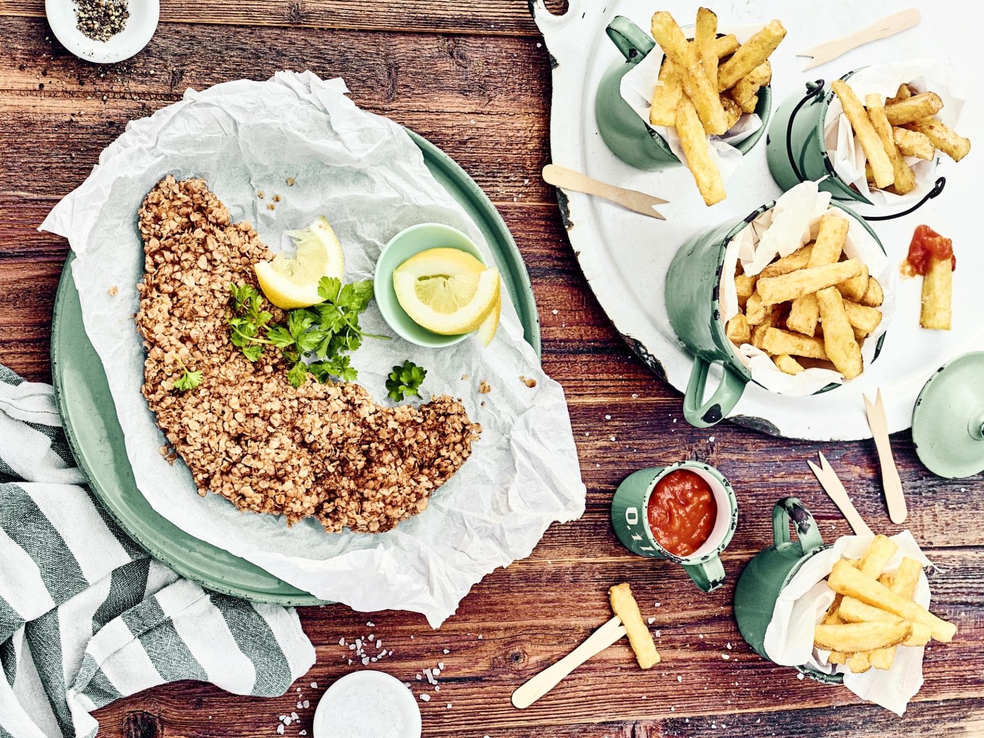 Klar, erst mit den richtigen Beilagen wird ein Schnitzel perfekt – und das gilt natürlich auch für unser knuspriges Schnitzel mit Haferflocken-Panade, das besonders toll zu Pommes schmeckt. Wer mag, kann diese natürlich auch aus Süßkartoffeln oder Karotten herstellen. Aber auch ein knackiger Salat passt toll zu Schnitzel. Wie wäre es zum Beispiel mit einem grünen Blattsalat, Gurkensalat, Apfel-Möhren-Salat oder auch einem Kartoffelsalat? Und wo wir schon beim Thema sind: Kartoffeln gehen sowieso immer!