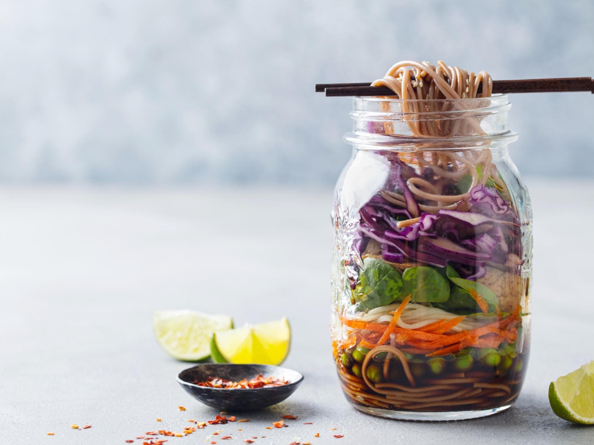 - Sind die Glasnudeln abgekühlt, können Sie diese gemeinsam mit dem Gemüse, der Gemüsebrühe/Würzpaste und dem Öl in das Schraubglas geben. Verwenden Sie bitte nur Gläser, die erhitzt werden können. Das befüllte Schraubglas nun über Nacht in den Kühlschrank stellen.
