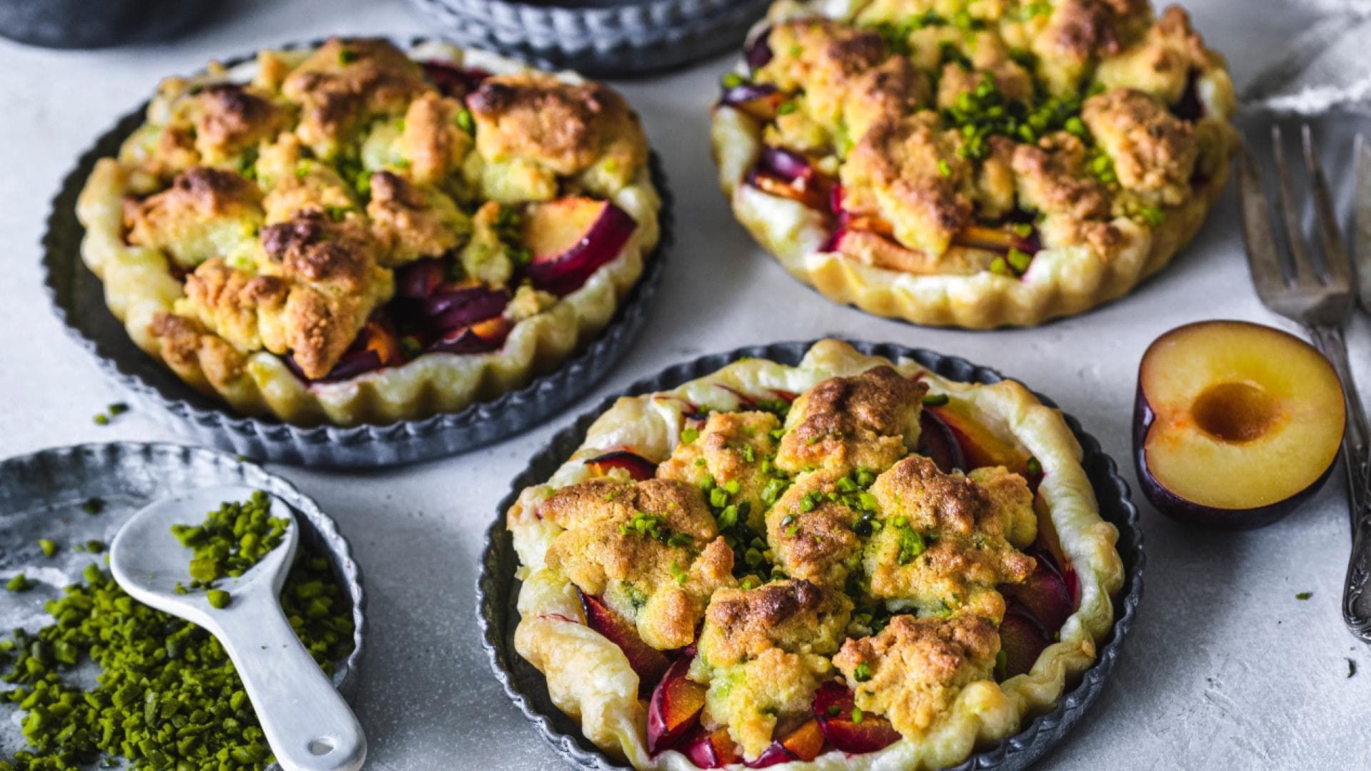 Unser Rezept für leckere Pflaumen-Torteletts mit Pistazien-Streuseln