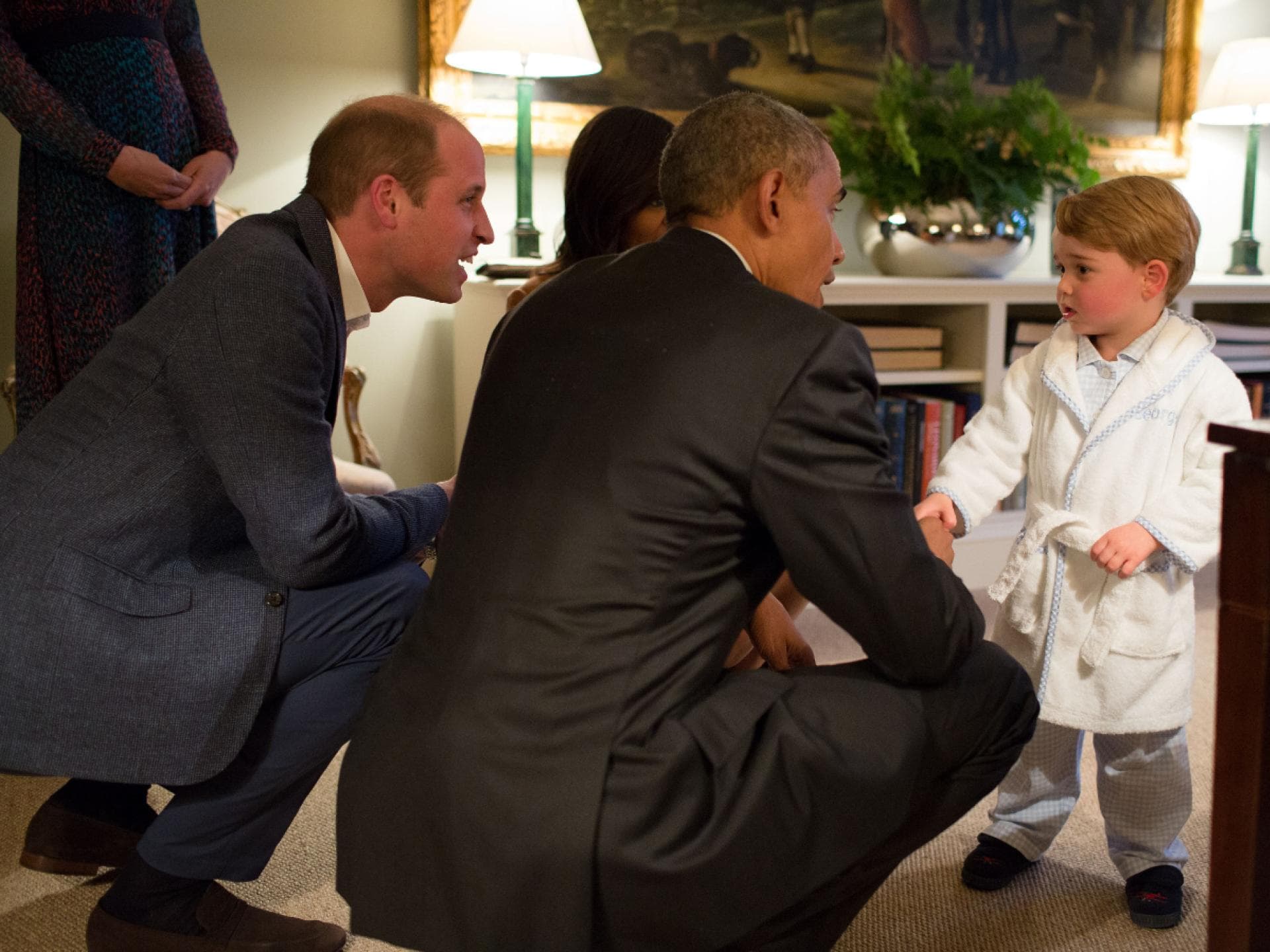Eine epische Begegnung: Der kleine Prinz George trifft auf den damaligen US-Präsidenten Barack Obama – vor dem Schlafengehen im Bademantel.
